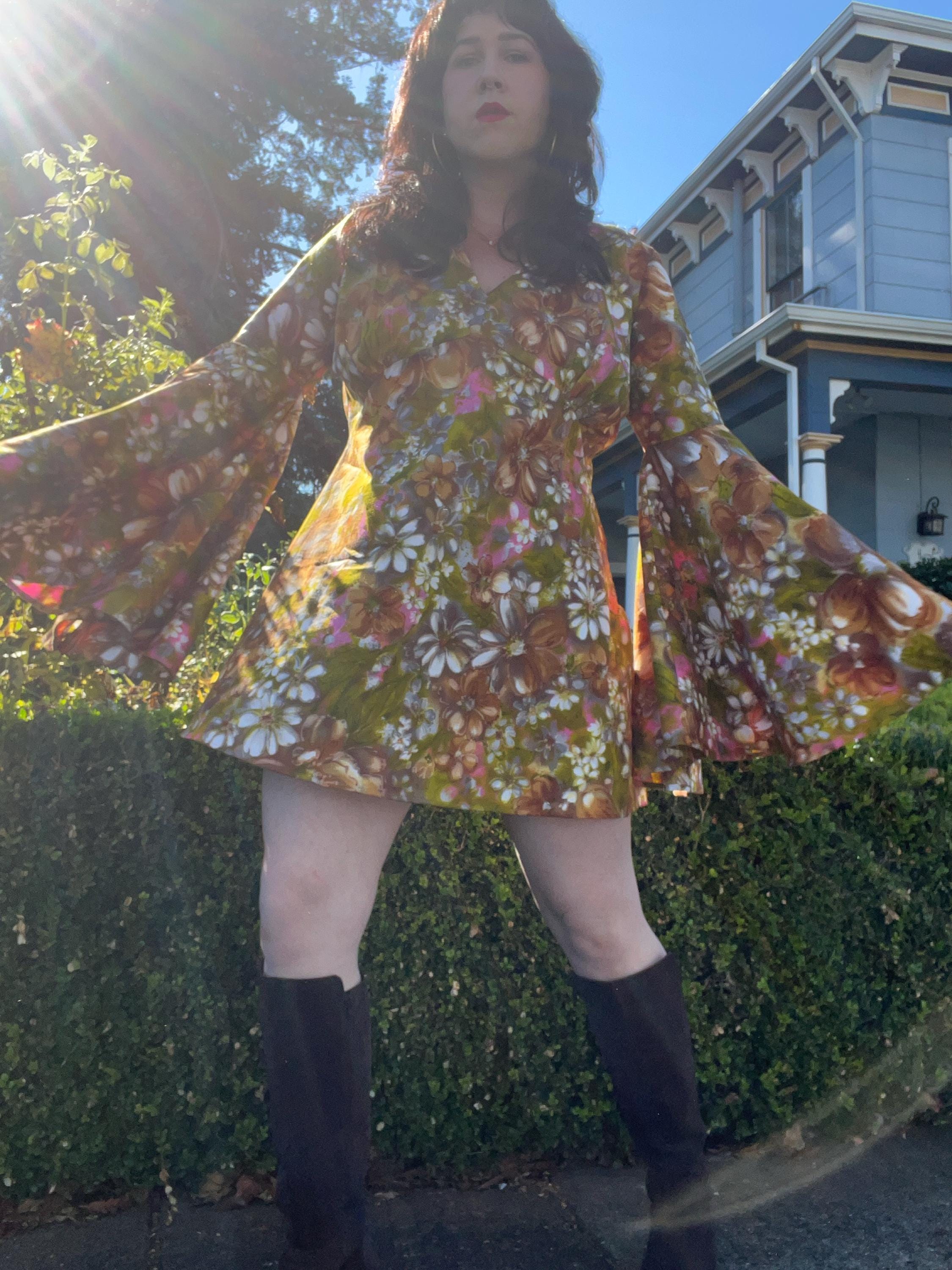 This is Ana dress - 70's inspired mini dress pattern with bell sleeve and v-neckline